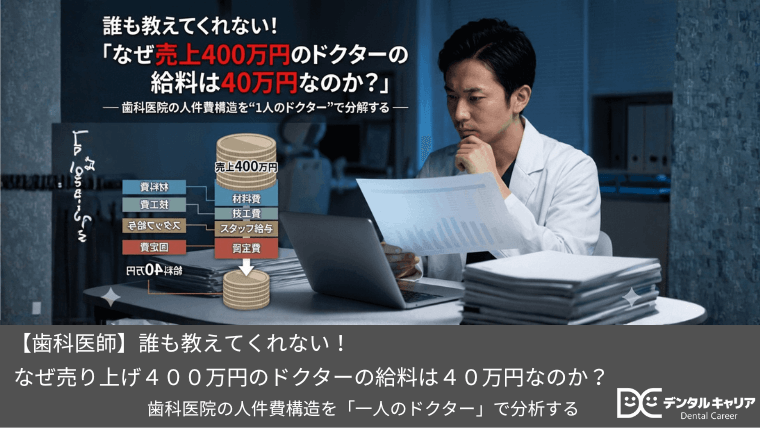 売上400万円はドクター1人の力ではなく、衛生士・助手・受付・技工・設備などを含めた「チーム売上」です。人件費30%は全員分なので、勤務医1人に使えるのは10〜15%程度になるのが一般的です。